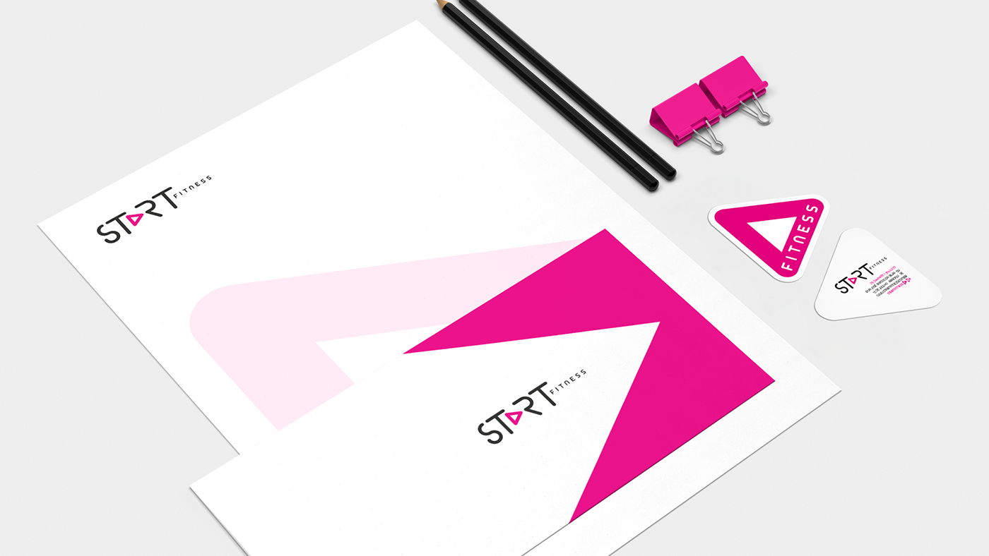 Quando tentamos traduzir todos os elementos da marca para um símbolo gráfico, que seja fácil de lembrar e que passe, em resumo, todos os elementos mais importante da marca, chegamos ao ícone. E para uma marca que vai representar os produtos de roupas e acessórios femininos, compilamos 2 coisas importantes para esse desafio. Primeiro pegamos, o triangulo que simboliza a mulher e juntamos ao Play. O Start, o inicio de um movimento, ao play de começar o dia com atitude no corpo e suor na roupa.